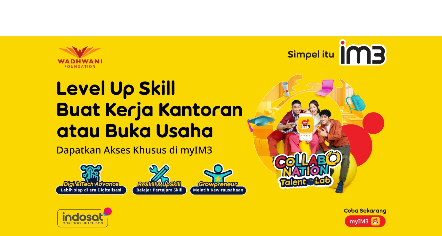 Buka lebih banyak peluang kerja & usaha bareng Talent Lab dari IM3 Collabonation x Wadhwani Foundation. Kamu bisa akses berbagai kursus digital interaktif berbasis AI di aplikasi myIM3. Level up starts here!
